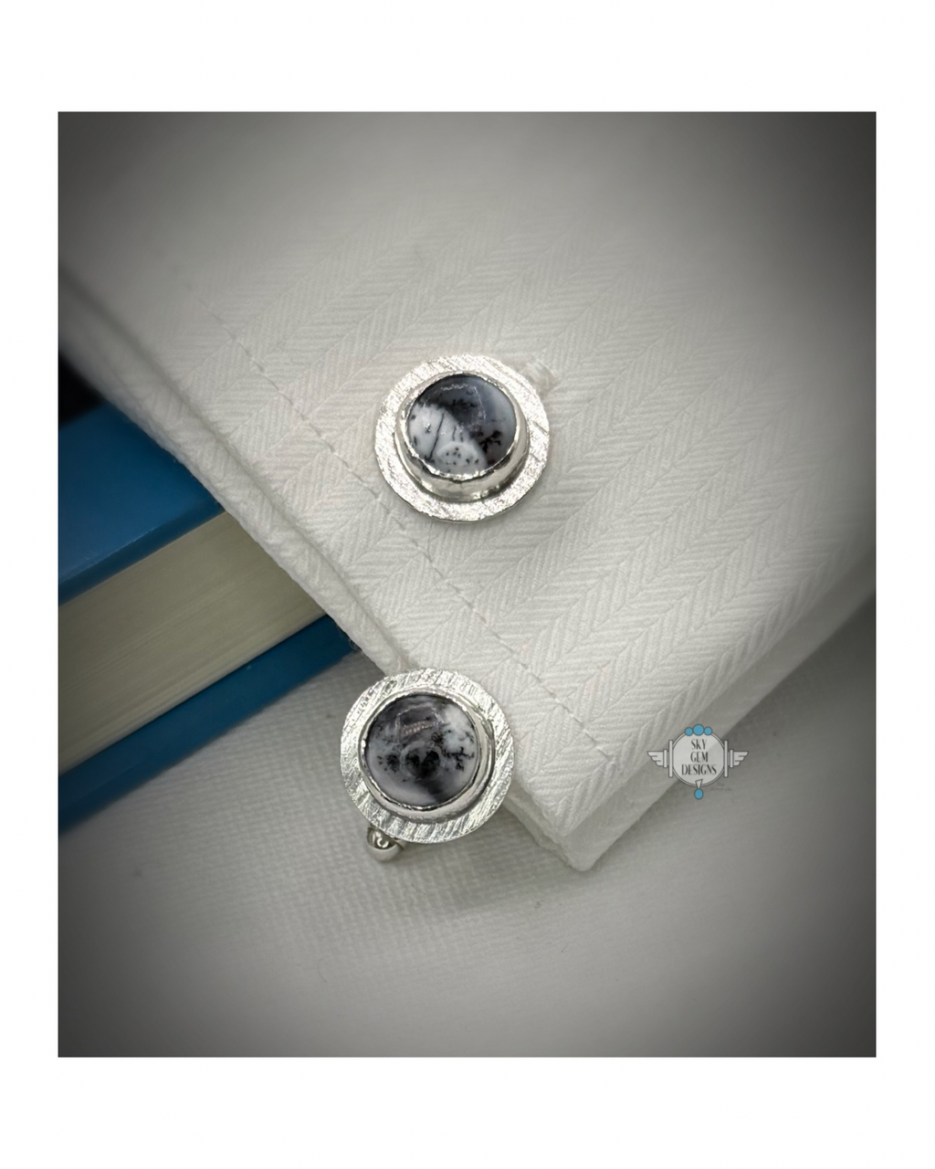 Snowy windows of silver frame beautiful winter landscapes that come to life in these Dendritic Opal Agates. Picture looking through to see a glimpse of a forest, or a mountain or birch trees or grass laden fields blanketed after a peaceful snowfall, enhanced by the calming, soothing effect of this unique gemstone. The appearance of fresh snow that surrounds various pieces was created with ancient silversmith technique of fusing silver dust to the back plate of the frame.
